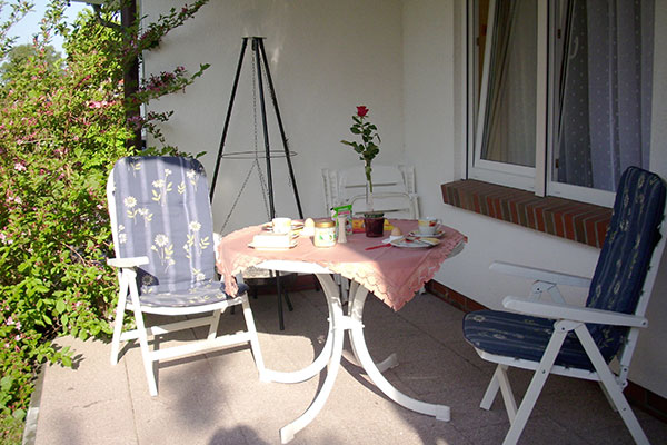 Gemütliche 3-Zimmer-Fewo mit Terrasse zur Südseite – in zentraler Lage – nicht weit vom Strand und nahe am Zentrum. Ideal für vier Personen. Ruhig gelegen mit Blick ins Grüne. Parkplatz vor der Tür.