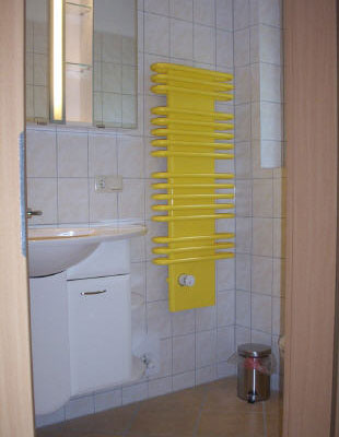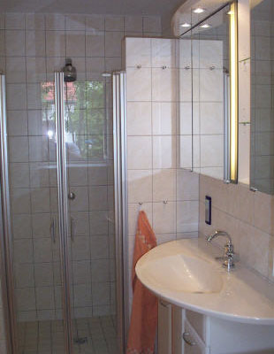 - Badezimmer mit ebenerdiger Dusche, WC und Waschbecken, Radio