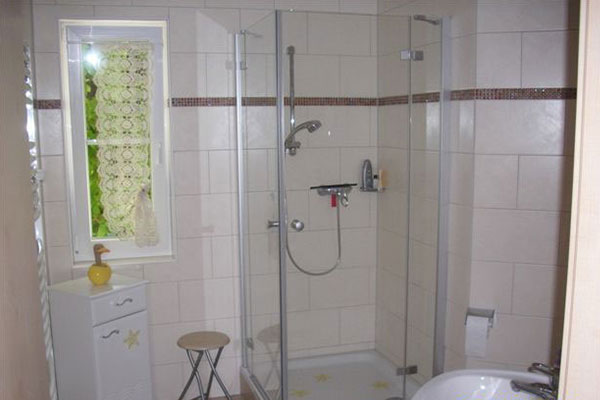 - Badezimmer mit Dusche (Echtglas), WC und Waschbecken, Radio, Fön